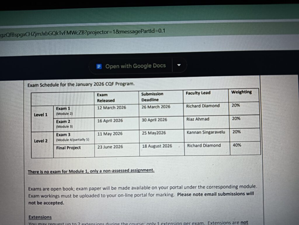CQF Exam January 2026 Cohort Exam Schedule is appended below :